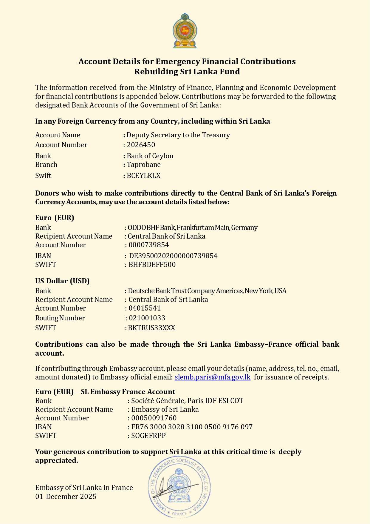 Account Details for Emergency Financial Contributions Rebuilding Sri Lanka Fund