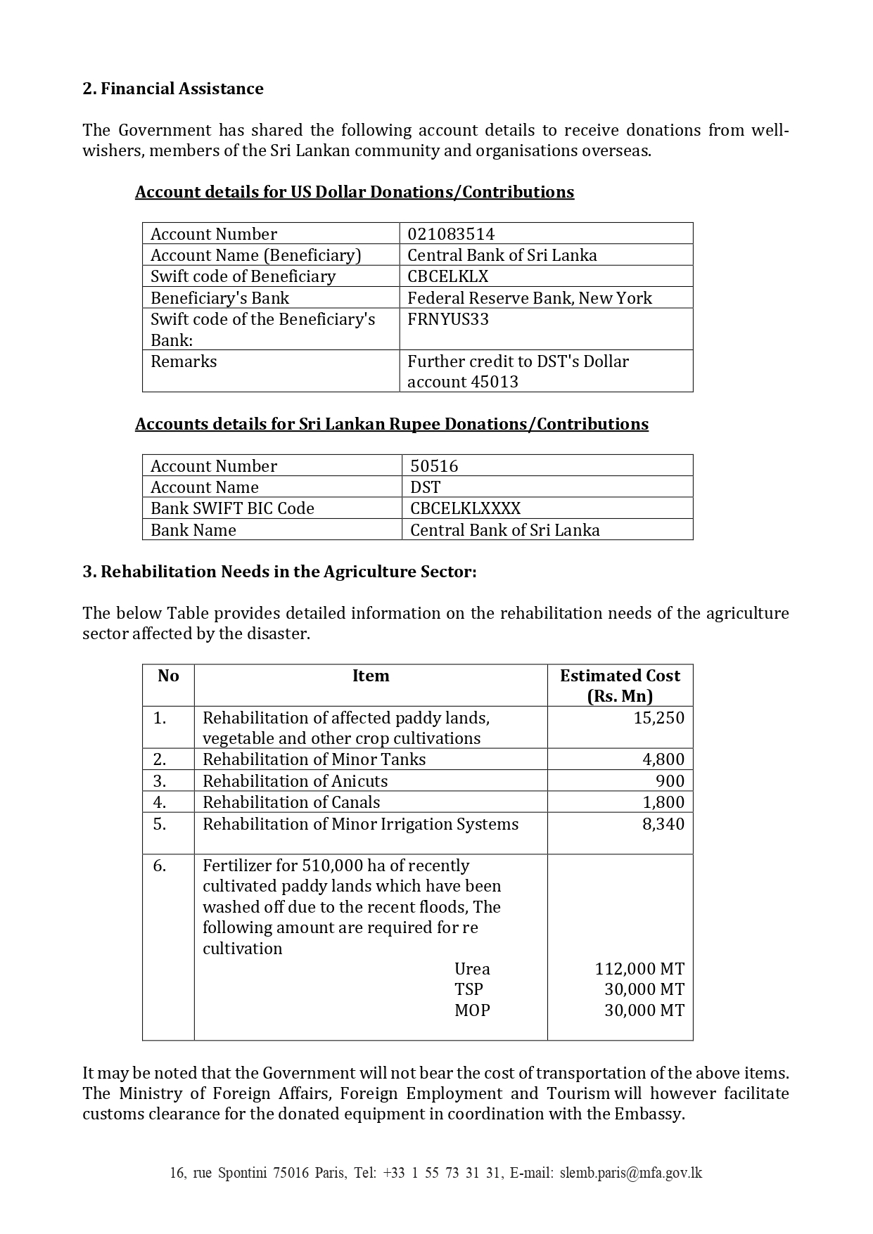Emergency Assistance urgently required by the Government of Sri Lanka following the Devastating Floods