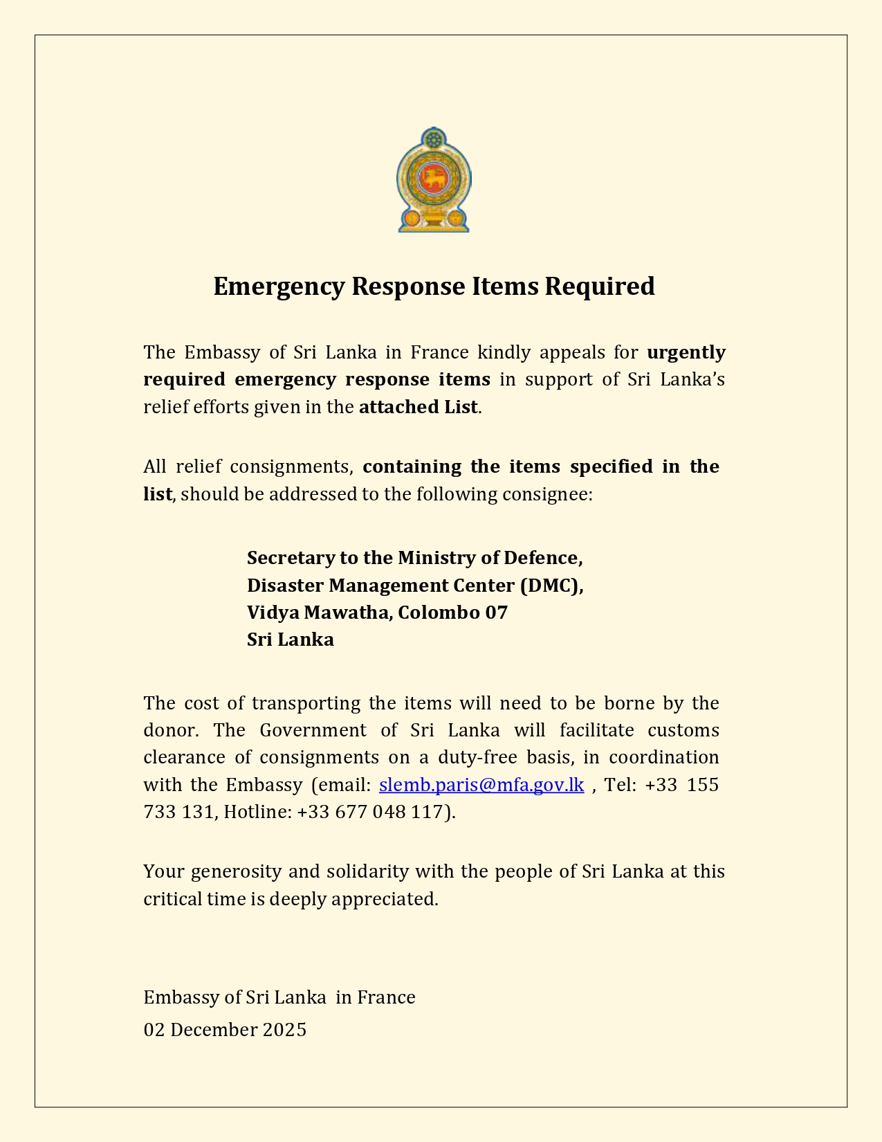 Revised Account Details for Emergency Financial Contributions Adverse Weather Conditions in Sri Lanka