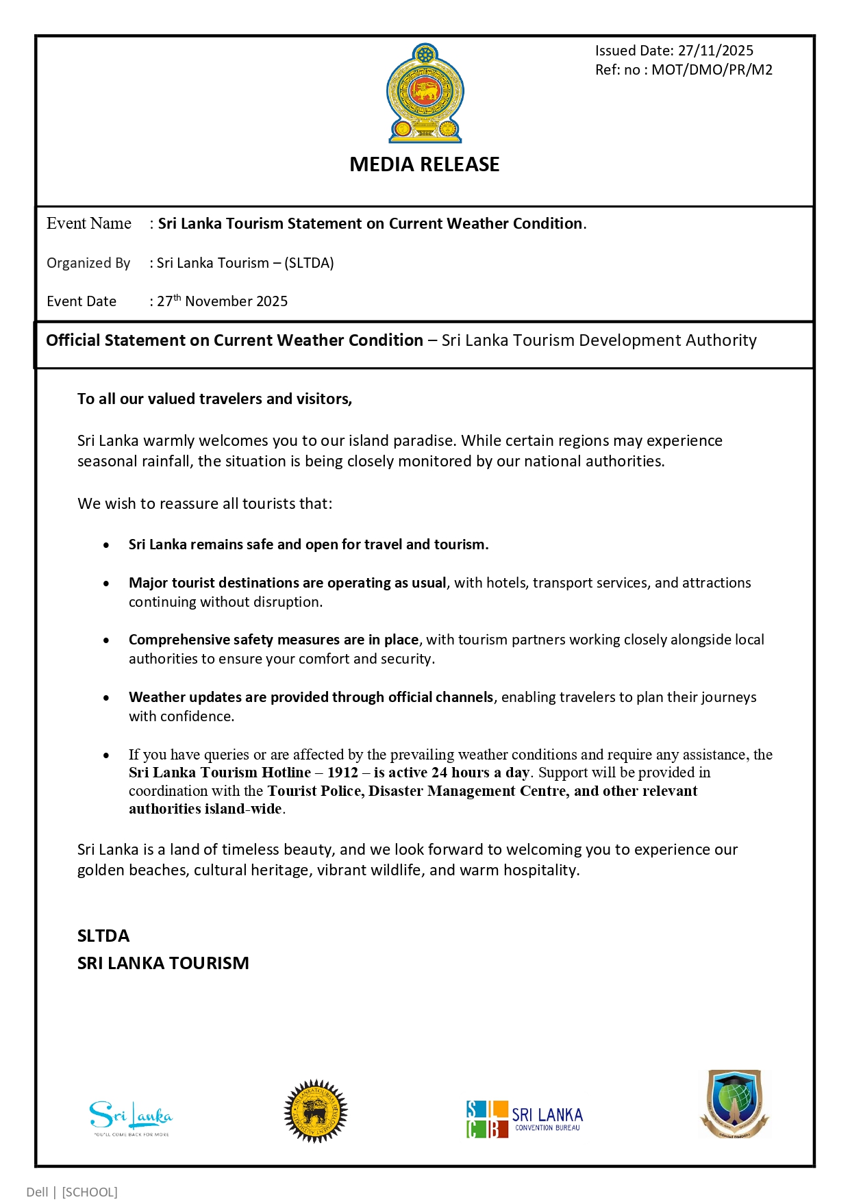 Sri Lanka Tourism Statement on Current Weather Condition