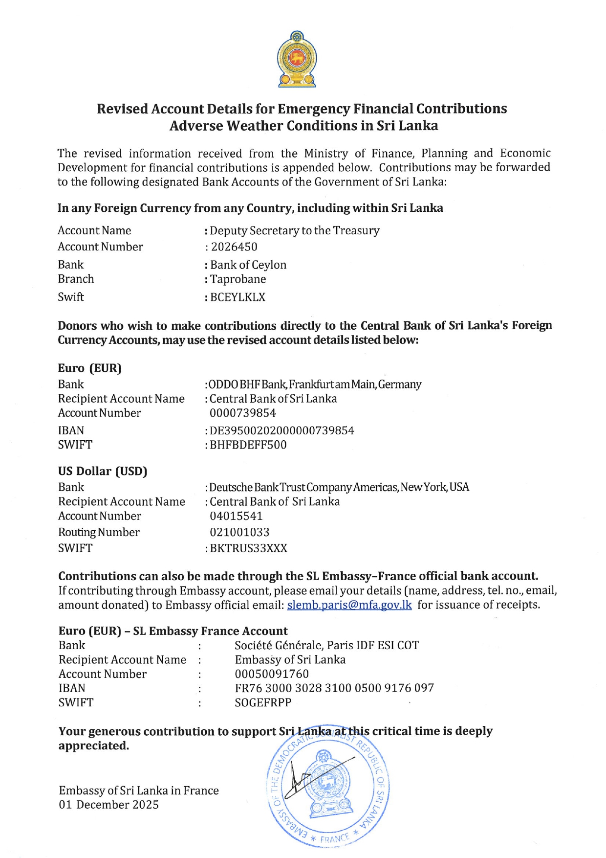 The Embassy of Sri Lanka in France kindly appeals for urgently required emergency response items in support of Sri Lan