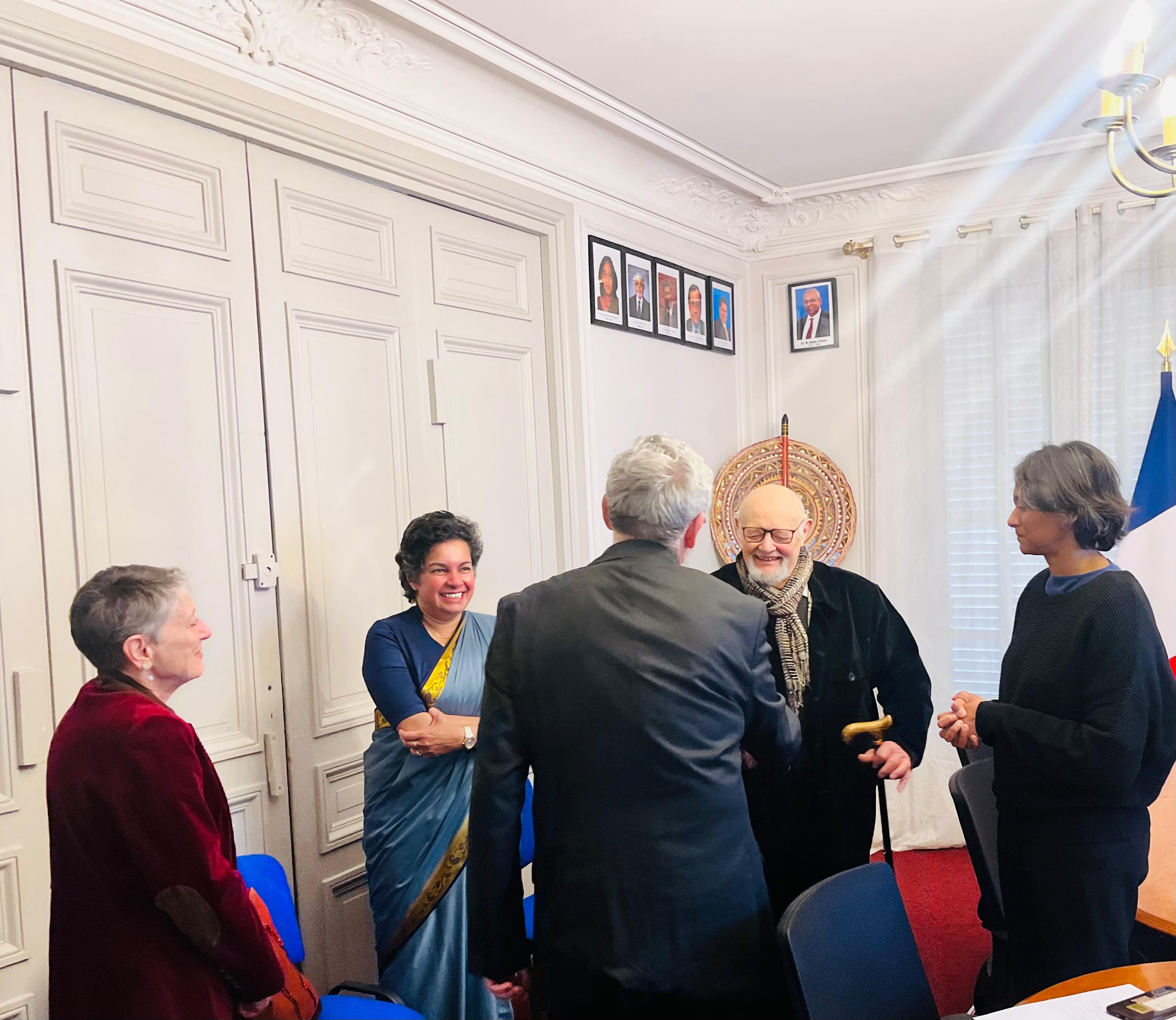 Speaking on the occasion, the Ambassador of Sri Lanka to France, Manisha Gunasekera, highlighted Prof. Meyer’s long and distinguished career, his close academic collaboration and links with Sri Lanka, and his invaluable contribution to enhancing academic and cultural ties between Sri Lanka and France over the years.  The Ambassador also recalled Prof. Meyer’s proactive role in establishing the “Friends of Sri Lanka” Group and the “Franco–Sri Lanka Study Circle” in France, under the patronage of the Sri Lanka Embassy, more than three decades ago.
