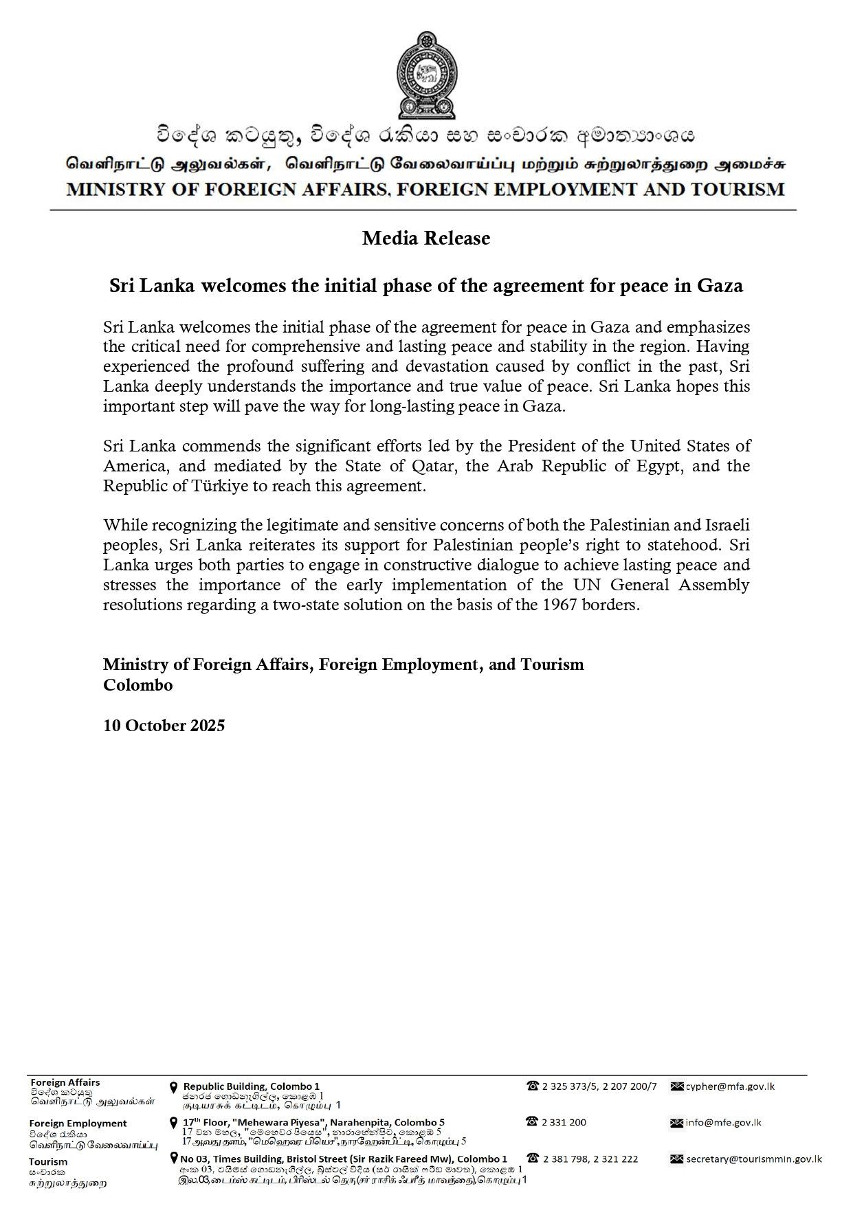 Sri Lanka welcomes the initial phase of the agreement for peace in Gaza