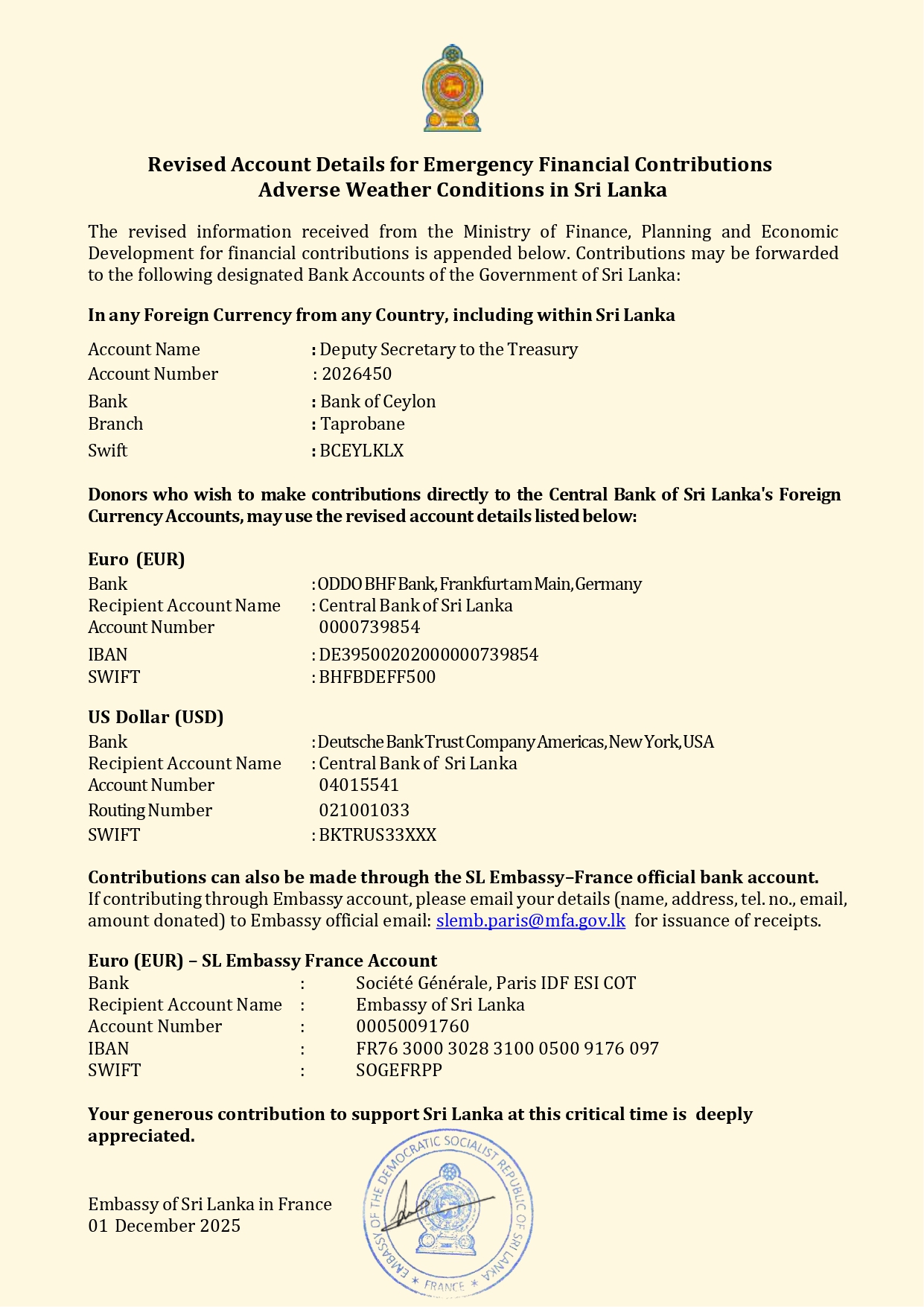 Revised Account Details for Emergency Financial Contributions Adverse Weather Conditions in Sri Lanka