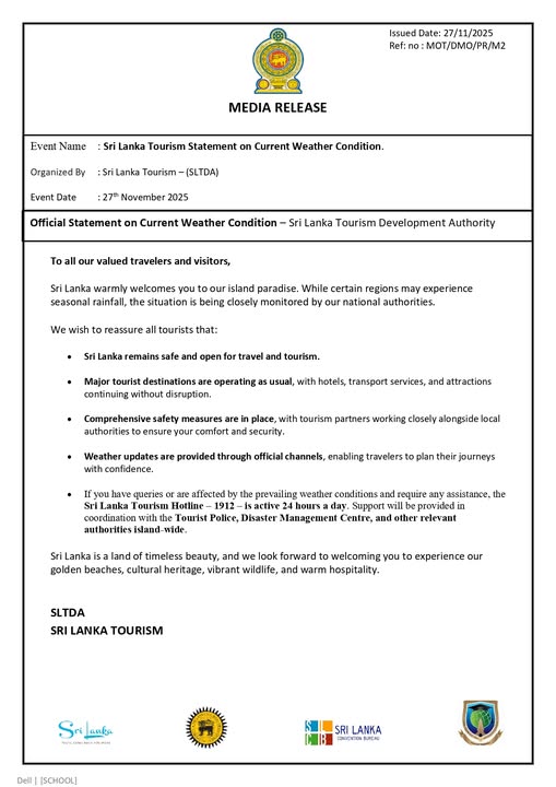 Sri Lanka Tourism Statement on Current Weather Condition